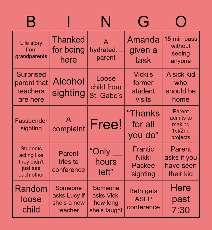 This bingo card has a free space and 24 words: Parent tries to conference, Someone asks Lucy if she’s a new teacher, Loose child from St. Gabe’s, Random loose child, 15 min pass without seeing anyone, Life story from grandparents, Surprised parent that teachers are here, Thanked for being here, “Thanks for all you do”, “Only __ hours left”, Vicki’s former student visits, Fassbender sighting, Frantic Nikki Packee sighting, Parent asks if you have seen their kid, Alcohol sighting, Beth gets ASLP conference, Parent admits to making 1st/2nd projects, A hydrated… parent, A sick kid who should be home, A complaint, Here past 7:30, Students acting like they didn’t just see each other, Amanda given a task and Someone asks Vicki how long she’s taught.