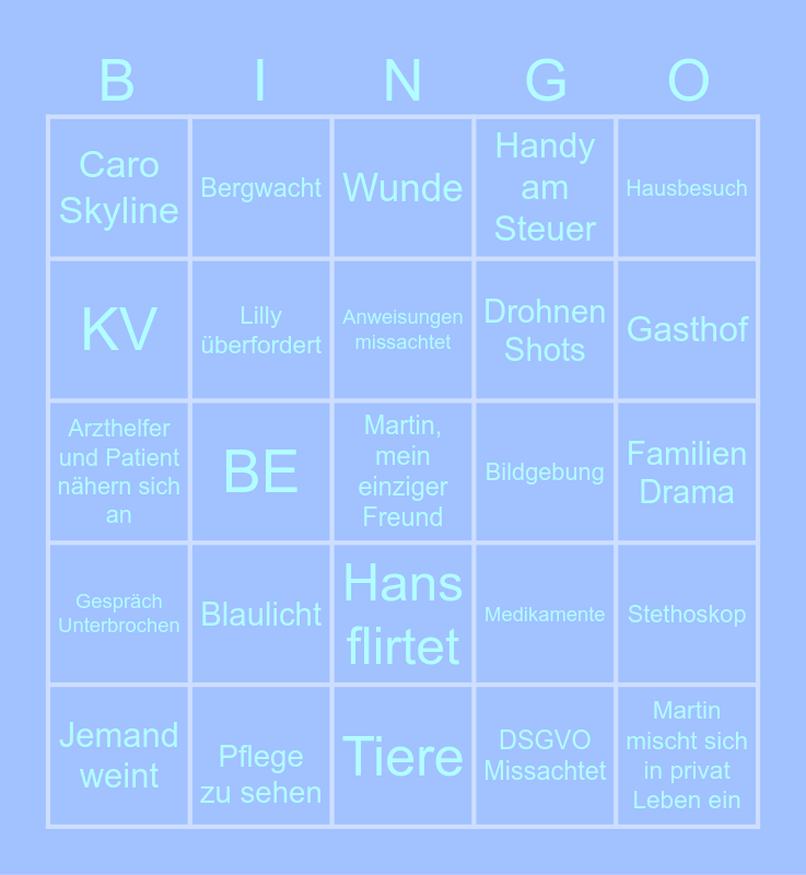 This bingo card has a free space and 24 words: Blaulicht, Pflege zu sehen, Anweisungen missachtet, Jemand weint, Hausbesuch, Caro Skyline, KV, Bergwacht, Bildgebung, Hans flirtet, Drohnen Shots, Arzthelfer und Patient nähern sich an, Medikamente, Stethoskop, Lilly überfordert, DSGVO Missachtet, Familien Drama, Wunde, Gasthof, BE, Martin mischt sich in privat Leben ein, Gespräch Unterbrochen, Handy am Steuer and Tiere.