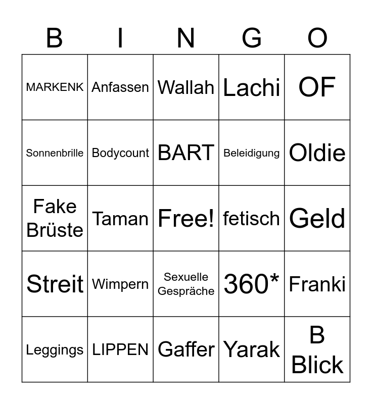 This bingo card has a free space and 24 words: Wimpern, LIPPEN, BART, Leggings, OF, MARKENK, Sonnenbrille, Anfassen, fetisch, Sexuelle Gespräche, Beleidigung, Fake Brüste, 360*, Franki, Bodycount, Yarak, Geld, Wallah, Oldie, Taman, B Blick, Streit, Lachi and Gaffer.