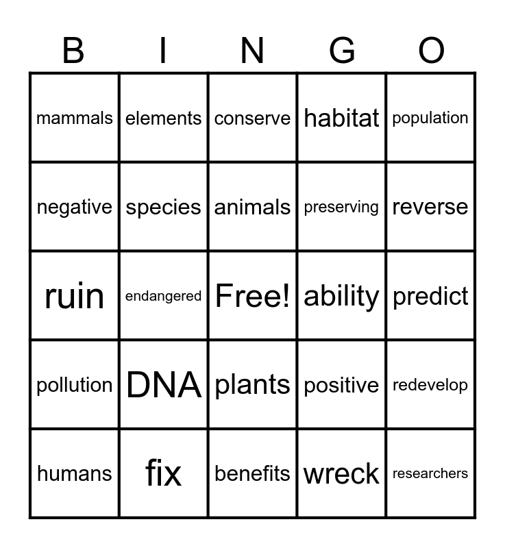 This bingo card has a free space and 39 words: extinct, extinction, effect, species, humans, plants, animals, scientist, population, pollution, endangered, habitat, researchers, predict, ability, DNA, survive, mammals, mammoth, positive, negative, benefits, preserving, reverse, Pyrenean ibex, gastric brooding frog, ecosystem, community, environment, elements, protect, save, conserve, fix, wreck, mend, redevelop, ruin and destroyed.