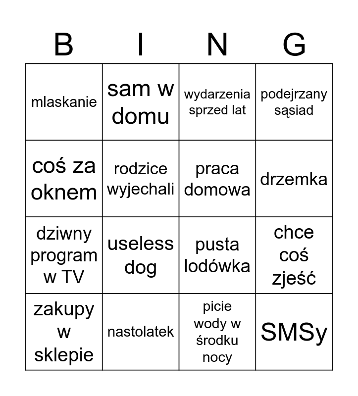 This bingo card has 16 words: nastolatek, chce coś zjeść, wydarzenia sprzed lat, mlaskanie, dziwny program w TV, sam w domu, pusta lodówka, picie wody w środku nocy, coś za oknem, rodzice wyjechali, zakupy w sklepie, podejrzany sąsiad, useless dog, drzemka, praca domowa and SMSy.