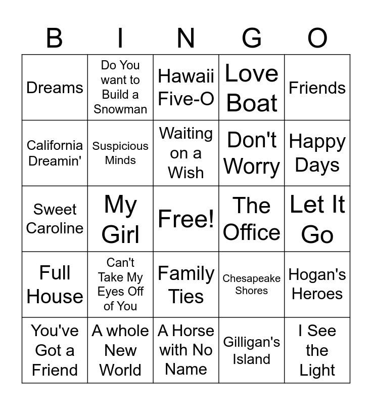 This bingo card has a free space and 25 words: Can't Take My Eyes Off of You, A Horse with No Name, Waiting on a Wish, You've Got a Friend, Friends, Dreams, California Dreamin', Do You want to Build a Snowman, The Office, Family Ties, Don't Worry, Sweet Caroline, Chesapeake Shores, Hogan's Heroes, Suspicious Minds, American Pie, Let It Go, Hawaii Five-O, Happy Days, My Girl, I See the Light, A whole New World, Full House, Love Boat and Gilligan's Island.