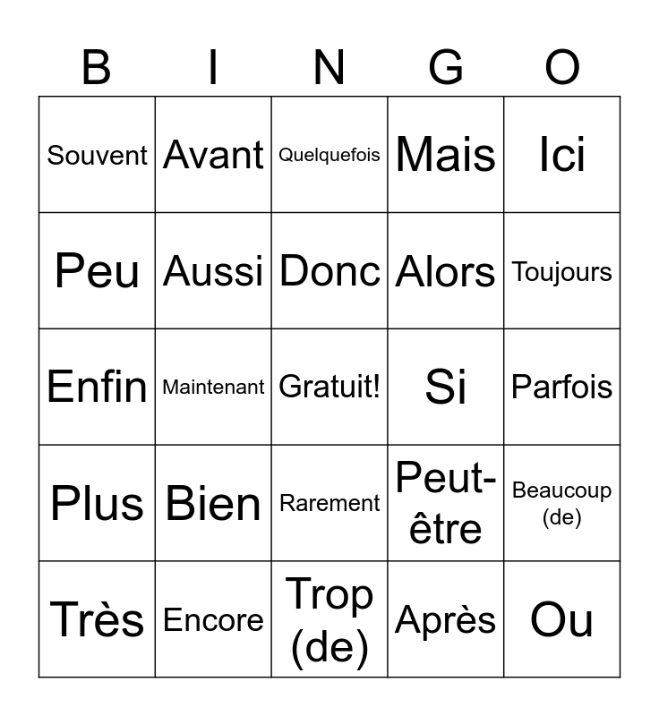 This bingo card has a free space and 37 words: Assez (de), Moins, Aujourd'hui, Aussi, Beaucoup (de), Bien, Donc, Demain, Ici, Là-bas, Maintenant, Mais, Ou, Parfois, Peu, Plus, Plutôt, Quelquefois, Rarement, Si, Souvent, Toujours, Très, Trop (de), Un peu (de), Après, Avant, Depuis, Pour, Hier, Déjà, Encore, Enfin, Ensemble, Peut-être, Alors and Là.