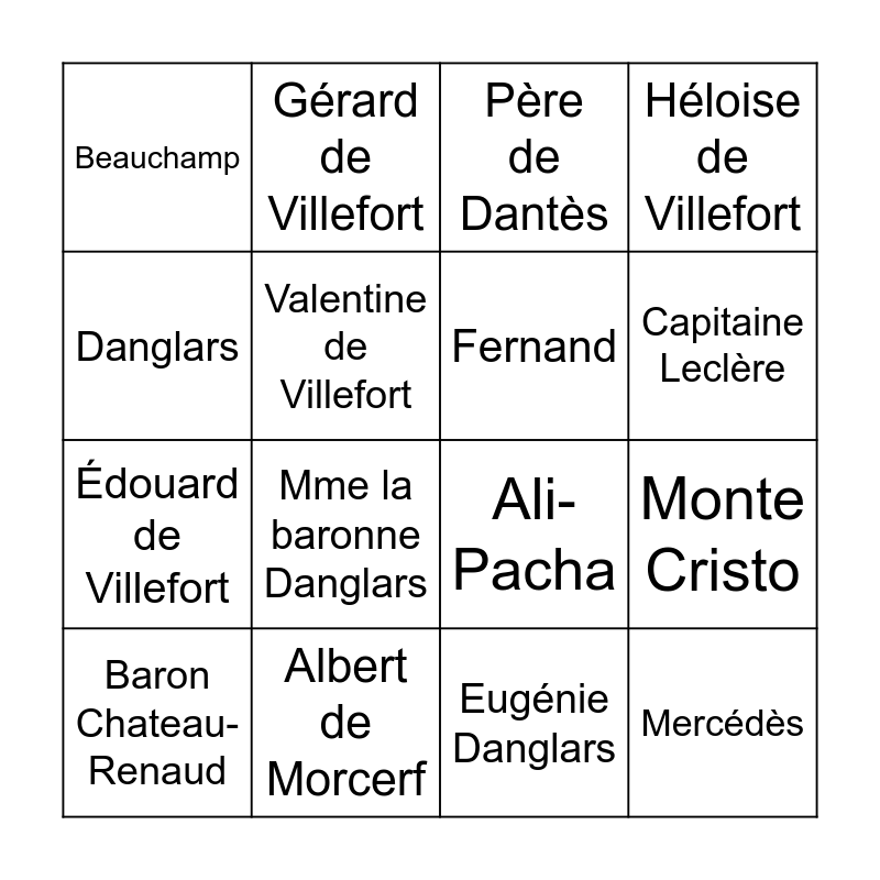 This bingo card has 33 words: Free!, Edmond Dantès, Monte Cristo, Abbé Faria, Mercédès, Fernand, Danglars, M. Morrel, Gérard de Villefort, Mme de Villefort, Capitaine Leclère, Père de Dantès, Gaspard Caderousse, Renée de Saint-Méran, Albert de Morcerf, Mme la baronne Danglars, Franz d’Épinay, Ali-Pacha, Luigi Vampa, Peppino, Maximilien Morrel, Haydée, Beauchamp, Eugénie Danglars, Lucien Debray, Baron Chateau-Renaud, Héloise de Villefort, Édouard de Villefort, Valentine de Villefort, Andrea Cavalcanti, Major Bartolomeo Cavalcanti, Benedetto and Le patron de la Jeune-Amélie.