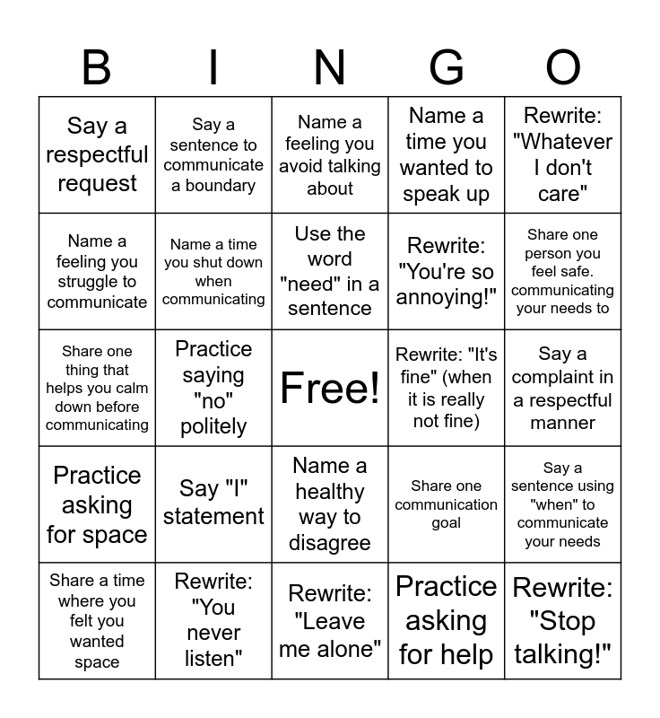 This bingo card has a free space and 24 words: Say "I" statement, Rewrite: "You never listen", Use the word "need" in a sentence, Share a time where you felt you wanted space, Rewrite: "Whatever I don't care", Say a respectful request, Name a feeling you struggle to communicate, Say a sentence to communicate a boundary, Rewrite: "It's fine" (when it is really not fine), Name a healthy way to disagree, Rewrite: "You're so annoying!", Share one thing that helps you calm down before communicating, Share one communication goal, Say a sentence using "when" to communicate your needs, Name a time you shut down when communicating, Practice asking for help, Say a complaint in a respectful manner, Name a feeling you avoid talking about, Share one person you feel safe. communicating your needs to, Practice saying "no" politely, Rewrite: "Stop talking!", Practice asking for space, Name a time you wanted to speak up and Rewrite: "Leave me alone".
