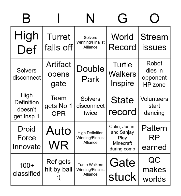 This bingo card has a free space and 28 words: Pattern RP earned, Droid Force Winning/Finalist Alliance, Turtle Walkers Inspire, Gate stuck, Solvers disconnect, Solvers Winning/Finalist Alliance, Turret falls off, Droid Force Innovate, State record, 100+ classified, High Definition doesn't get Insp 1, World Record, Ref gets hit by ball :(, Turtle Walkers Winning/Finalist Alliance, Robot dies in opponent HP zone, Massive alliance scorch, Auto WR, Artifact opens gate, Double Park, High Definition Winning/Finalist Alliance, High Def, Team opens opponent goal, QC makes worlds, Team gets No.1 OPR, Volunteers start dancing, Colin, Justin, and Sanjay Play Minecraft during comp, Stream issues and Comp ends > 30 min late.