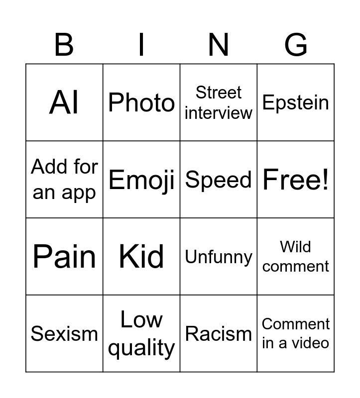 This bingo card has 17 words: Racism, Sexism, Street interview, AI, Kid, Epstein, Wild comment, Speed, Free!, Emoji, Low quality, Unfunny, Add for an app, Photo, Pain, Someone saying wild stuff and Comment in a video.