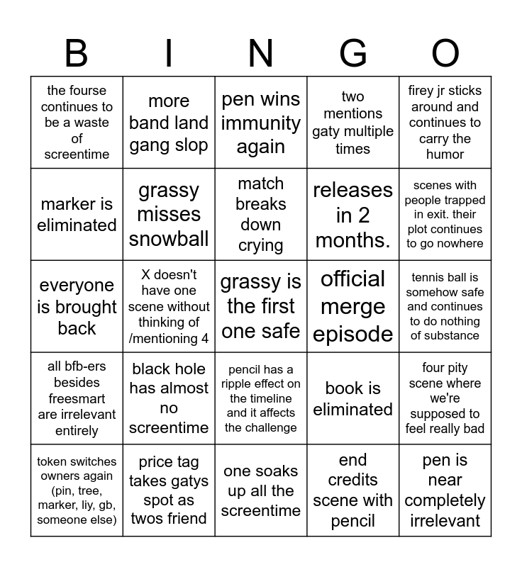 This bingo card has a free space and 24 words: black hole has almost no screentime, price tag takes gatys spot as twos friend, match breaks down crying, token switches owners again (pin, tree, marker, liy, gb, someone else), firey jr sticks around and continues to carry the humor, the fourse continues to be a waste of screentime, marker is eliminated, more band land gang slop, official merge episode, pencil has a ripple effect on the timeline and it affects the challenge, releases in 2 months., everyone is brought back, book is eliminated, four pity scene where we're supposed to feel really bad, grassy misses snowball, end credits scene with pencil, tennis ball is somehow safe and continues to do nothing of substance, pen wins immunity again, scenes with people trapped in exit. their plot continues to go nowhere, X doesn't have one scene without thinking of /mentioning 4, pen is near completely irrelevant, all bfb-ers besides freesmart are irrelevant entirely, two mentions gaty multiple times and one soaks up all the screentime.