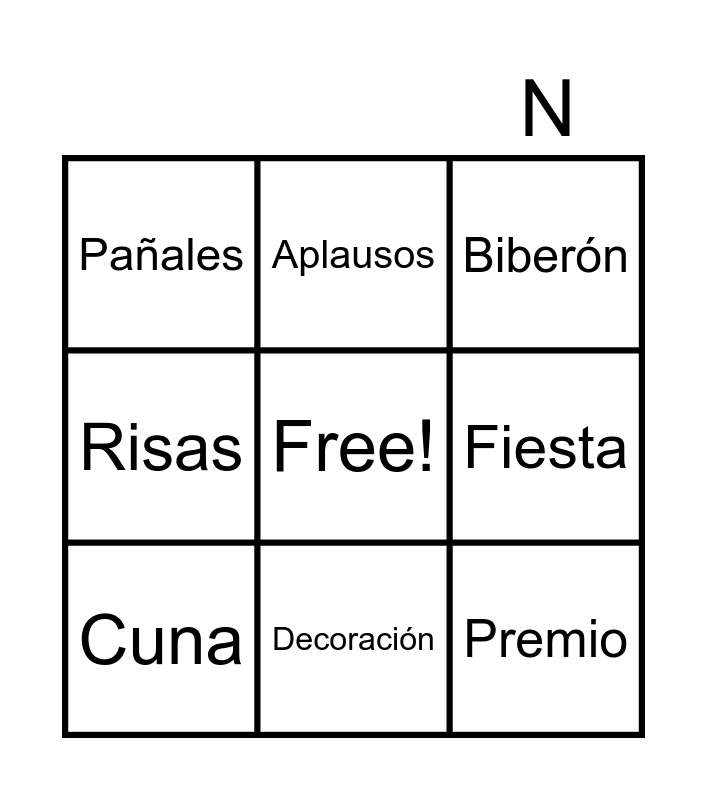 This bingo card has a free space and 30 words: Niño, Niña, Bebé, Guagua, Pañales, Biberón, Cuna, Leche, Barriga, Eco, Corazón, Familia, Mamá, Papá, Abuela, Padrinos, Globos, Confeti, Regalo, Premio, Sorpresa, Revelación, Aplausos, Música, Fiesta, Risas, Fotos, Video, Decoración and Emoción.