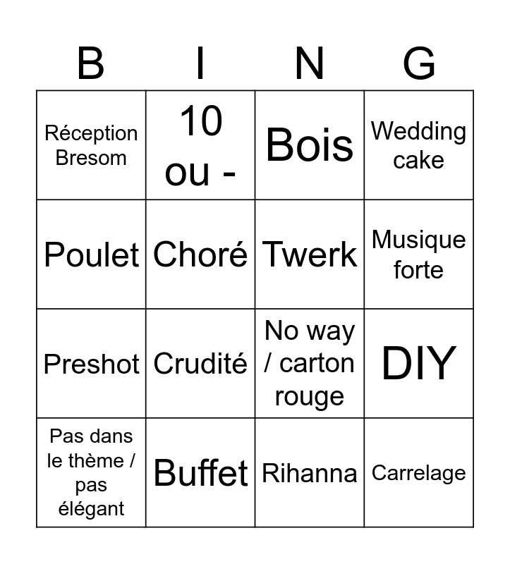 This bingo card has 16 words: Buffet, DIY, Bois, Réception Bresom, Preshot, 10 ou -, No way / carton rouge, Rihanna, Poulet, Choré, Pas dans le thème / pas élégant, Wedding cake, Crudité, Musique forte, Twerk and Carrelage.