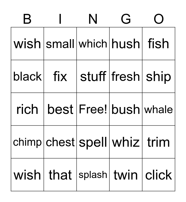 This bingo card has a free space and 29 words: wish, champ, best, fell, wish, which, fix, chest, bush, that, whale, click, splash, twin, ship, drift, spell, chimp, fish, rich, whiz, sick, fresh, black, hush, small, trim, stuff and sloth.
