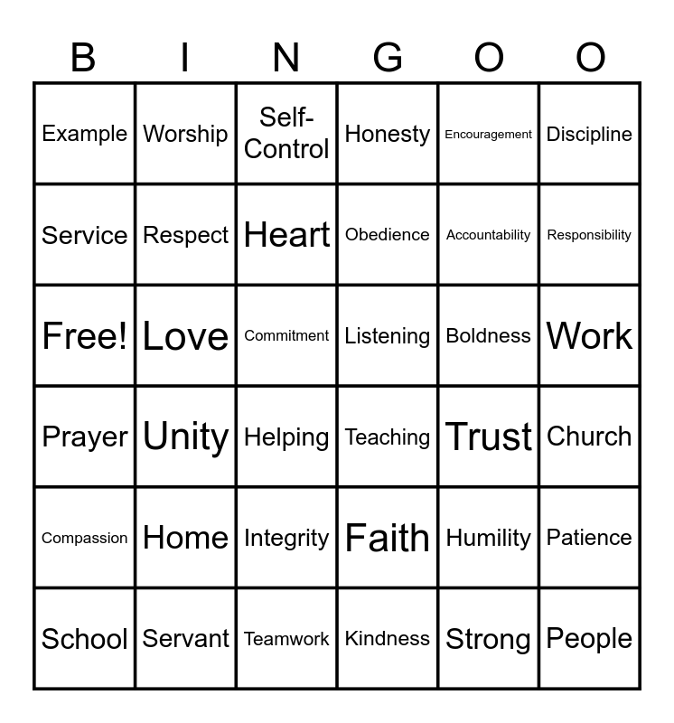 This bingo card has 36 words: Faith, Integrity, Kindness, Service, Prayer, Listening, Respect, Teamwork, Encouragement, Humility, Responsibility, Honesty, Patience, Love, Obedience, Example, Compassion, Boldness, Free!, Self-Control, Commitment, Unity, Teaching, Helping, Trust, Worship, Accountability, Servant, Heart, Discipline, People, School, Church, Work, Home and Strong.