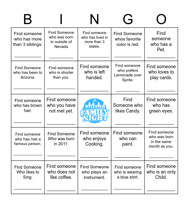 This bingo card has a free space and 25 words: Find Someone Who was born in 2011. ____________, Find Someone who plays an instrument. ___________, Find someone who is left handed. ___________, Find Someone Who likes to Sing. ____________, Find someone who has a Pet. ___________, Find someone who has more than 3 siblings. ___________, Find Someone who has been to Arizona. _____________, Find Someone who was born in outside of Nevada ___________, Find Someone who likes Candy. __________, Find someone who enjoys Cooking. ___________, Find someone who prefers Lemonade over Sprite. ___________, Find someone who has brown hair. ____________, Find someone who can paint. __________, Find someone who was born in the same month as you. ___________, Find someone who is shorter than you. _____________, Find someone who has been on a cruise. ___________, Find someone who has green eyes. __________, Find someone who has lived in more than 3 states. ______________, Find someone who loves to play cards. ___________, Find someone who you have not met yet. ___________, Find someone who is an only Child. ___________, Find someone who does not like coffee. ___________, Find someone who has met a famous person. _____________, Find Someone whos favorite color is red. ___________ and Find someone who is wearing a blue shirt. ____________.