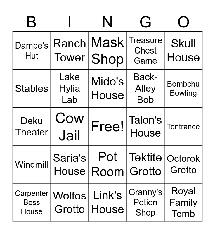 This bingo card has a free space and 25 words: Saria's House, Link's House, Mido's House, Carpenter Boss House, Skull House, Dampe's Hut, Stables, Ranch Tower, Talon's House, Pot Room, Back-Alley Bob, Deku Theater, Tektite Grotto, Octorok Grotto, Lake Hylia Lab, Fishing Pond, Tentrance, Mask Shop, Bombchu Bowling, Cow Jail, Royal Family Tomb, Wolfos Grotto, Windmill, Treasure Chest Game and Granny's Potion Shop.