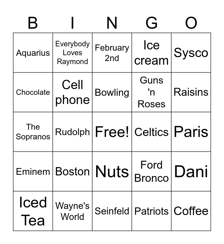 This bingo card has a free space and 24 words: Boston, Wayne's World, Bowling, Iced Tea, Sysco, Aquarius, Chocolate, Everybody Loves Raymond, Celtics, Nuts, Guns 'n Roses, The Sopranos, Ford Bronco, Dani, Cell phone, Patriots, Paris, February 2nd, Raisins, Rudolph, Coffee, Eminem, Ice cream and Seinfeld.