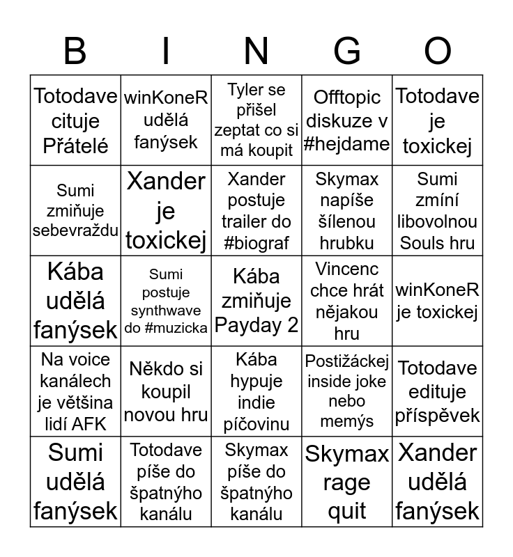 This bingo card has 25 words: Někdo si koupil novou hru, Skymax píše do špatnýho kanálu, Xander postuje trailer do #biograf, Sumi udělá fanýsek, Totodave je toxickej, Totodave cituje Přátelé, Sumi zmiňuje sebevraždu, winKoneR udělá fanýsek, Vincenc chce hrát nějakou hru, Kába hypuje indie píčovinu, Skymax napíše šílenou hrubku, Kába udělá fanýsek, Postižáckej inside joke nebo memýs, Totodave edituje příspěvek, Xander je toxickej, Xander udělá fanýsek, winKoneR je toxickej, Tyler se přišel zeptat co si má koupit, Sumi zmíní libovolnou Souls hru, Sumi postuje synthwave do #muzicka, Kába zmiňuje Payday 2, Totodave píše do špatnýho kanálu, Na voice kanálech je většina lidí AFK, Offtopic diskuze v #hejdame and Skymax rage quit.