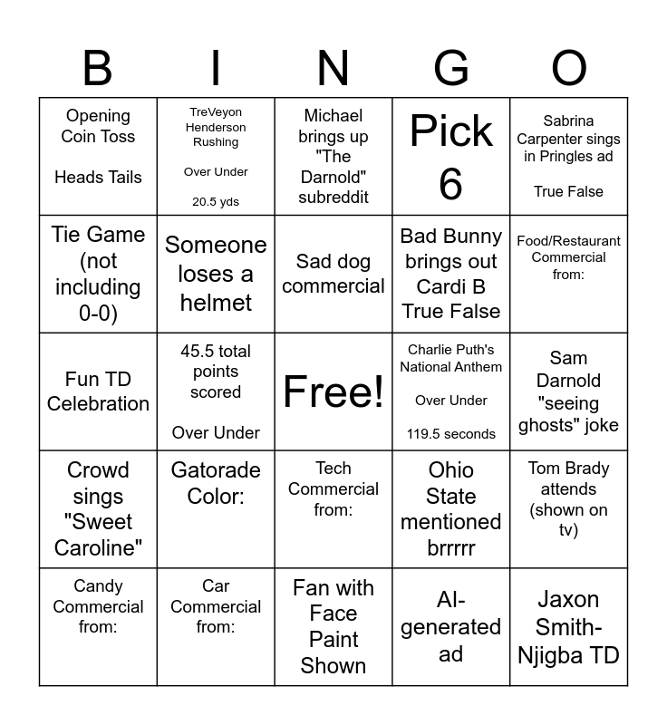 This bingo card has a free space and 29 words: Candy Commercial from:, Going for it on a fourth down, 45.5 total points scored Over Under, Travis Kelce/Taylor Swift attends (shown on tv), Opening Coin Toss Heads Tails, Michael brings up "The Darnold" subreddit, Someone loses a helmet, Gatorade Color:, Charlie Puth's National Anthem Over Under 119.5 seconds, Car Commercial from:, Sam Darnold "seeing ghosts" joke, Jaxon Smith-Njigba TD, Fan with Face Paint Shown, AI-generated ad, Food/Restaurant Commercial from:, Beer Commercial from:, Tech Commercial from:, Crowd sings "Sweet Caroline", Sabrina Carpenter sings in Pringles ad True False, Fun TD Celebration, Ohio State mentioned brrrrr, Who wins? Seahawks Patriots, Bad Bunny brings out Cardi B True False, Tie Game (not including 0-0), Pick 6, TreVeyon Henderson Rushing Over Under 20.5 yds, Tom Brady attends (shown on tv), Sad dog commercial and Soda Commercial from:.