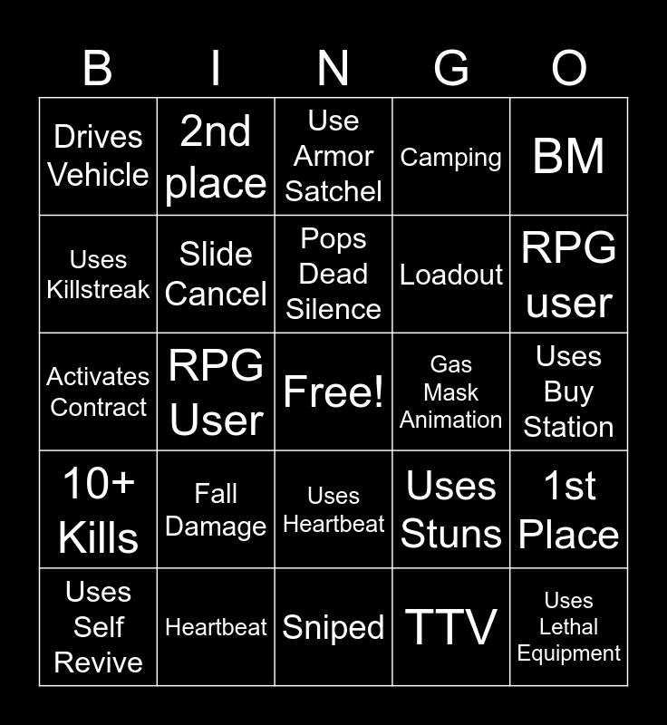 This bingo card has a free space and 30 words: Uses Zipline, Heartbeat, Use Armor Satchel, Uses Parachute, BM, Drives Vehicle, Slide Cancel, Pops Dead Silence, Loadout, Uses Lethal Equipment, Uses Self Revive, Fall Damage, TTV, Dies in 10 sec, 10+ Kills, Meta Kill, Sniped, Gas Mask Animation, 1st Place, Uses Killstreak, RPG User, 5 kills on spectate, Camping, Uses Buy Station, Activates Contract, 2nd place, Uses Heartbeat, Uses Stuns, RPG user and Cars end circle.