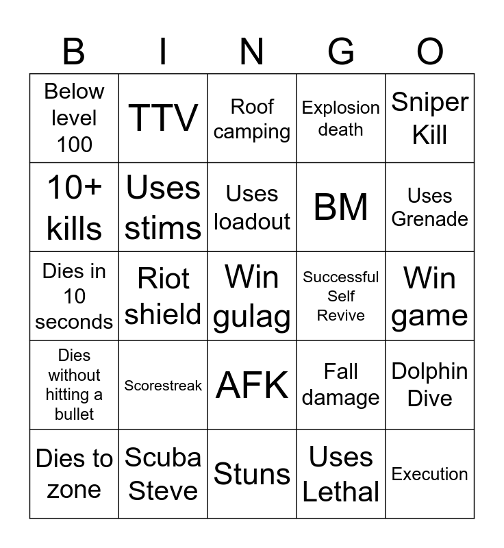 This bingo card has a free space and 24 words: Scorestreak, Scuba Steve, Uses loadout, Dies to zone, Sniper Kill, Below level 100, 10+ kills, TTV, Successful Self Revive, AFK, BM, Dies in 10 seconds, Fall damage, Dolphin Dive, Uses stims, Uses Lethal, Win game, Roof camping, Uses Grenade, Riot shield, Execution, Dies without hitting a bullet, Explosion death and Stuns.
