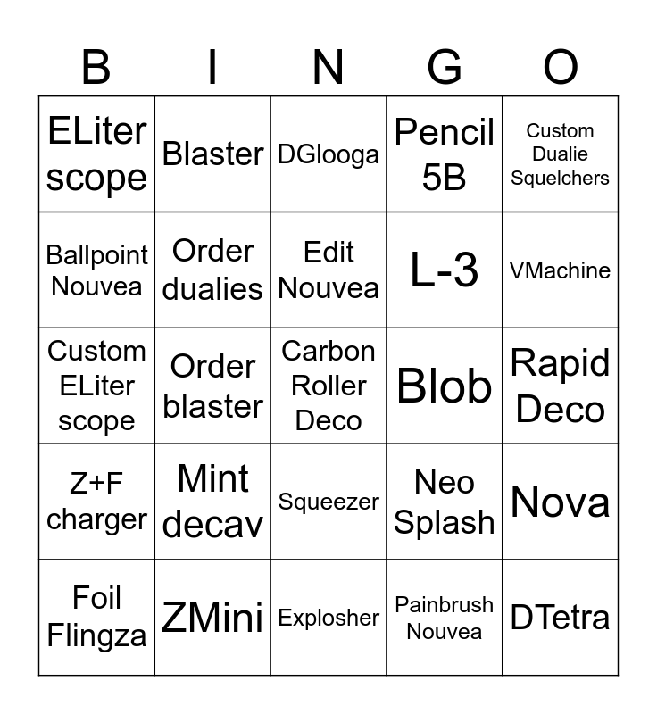 This bingo card has a free space and 144 words: Sploosh, Neo Sploosh, Splat Jr, C Splat JR, Splash, Neo Splash, Areospray, Gold Areospray, Splattershot, Tentatek splattershot, Hero shot, Order shot, .52 deco, N Zap 85, N Zap 89, Splat pro, Forge Splat pro, .96 gal, .96 deco, Vjet, Cjet, Nova, Annaki Nova, Luna blaster, Neo Luna, Order blaster, Blaster, CBlaster, VRange, CRange, Clash, Clash Neo, Rapid, Rapid Deco, Rapid pro, Rapid pro deco, S Blast 92, S Blast 91, L-3, L-3 D, H-3, H-3 D, Squeezer, Foil Squeezer, VCarbon, .52 gal, Splat roller, Krak roller, Order roller, Dynamo, Gold Dynamo, Flingza, Foil Flingza, Swig, Swig Express, Inkbrush, Inkbrush Nouvea, Octobrush, Octobrush Nouvea, Orderbrush, Painbrush, Painbrush Nouvea, VSquiff, NSquiff, Splat charger, Z+F charger, Order charger, Splatterscope, Z+F scope, ELiter, Custom Eliter, ELiter scope, Custom ELiter scope, Bamboo 1, Bamboo 2, Vgoo, Cgoo, VPencil, Pencil 5B, VSlosher, DSlosher, OSlosher, Tri slosh, Tri slosh Nouvea, VMachine, NMachine, Blob, Blob Deco, Explosher, Explosher Custom, VDread, DDread, VMini, ZMini, VHeavy, DHeavy, Order heavy, Hydra, Custom Hydra, Ballpoint, Ballpoint Nouvea, Naut 47, Naut 79, Edit, Edit Nouvea, Dapple, Dapple Nouvea, Splat Dualies, Enperry Dualies, Order dualies, VGlooga, DGlooga, Dualie Squelchers, Custom Dualie Squelchers, DTetra, LTetra, Douser, Custom Douser, Brella, Sorella brella, Order brella, Tenta brella, Tenta sorella brella, Vunder, Sunder, Recycled 1, Recycled 2, Tri string, Inkline tri string, Order string, REEFLUX, REEFLUX deco, Wellstring, Custom wellstring, Stamper, Stamper nouvea, Wiper, Wiper deco, Order splatana, Mint decav, Charcoal decav, Two of same weapon, All different class and 3 of same weapon combined teams.