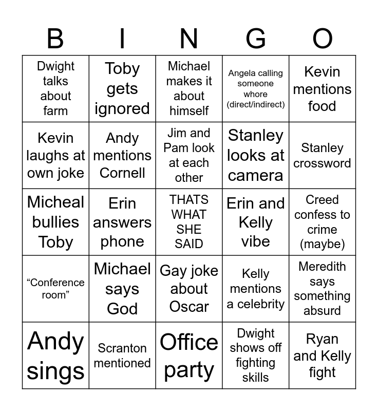 This bingo card has a free space and 24 words: Michael says God, Scranton mentioned, Jim and Pam look at each other, Andy sings, Kevin mentions food, Dwight talks about farm, Kevin laughs at own joke, Toby gets ignored, Erin and Kelly vibe, Gay joke about Oscar, Stanley looks at camera, Micheal bullies Toby, Kelly mentions a celebrity, Meredith says something absurd, Andy mentions Cornell, Dwight shows off fighting skills, Creed confess to crime (maybe), Michael makes it about himself, Stanley crossword, Erin answers phone, Ryan and Kelly fight, “Conference room”, Angela calling someone whore (direct/indirect) and Office party.