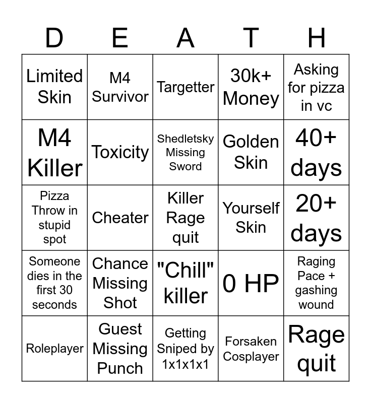 This bingo card has a free space and 24 words: Chance Missing Shot, Guest Missing Punch, Shedletsky Missing Sword, Roleplayer, Asking for pizza in vc, Limited Skin, M4 Killer, M4 Survivor, Yourself Skin, "Chill" killer, Golden Skin, Pizza Throw in stupid spot, 0 HP, Raging Pace + gashing wound, Toxicity, Forsaken Cosplayer, 20+ days, Targetter, 40+ days, Cheater, Rage quit, Someone dies in the first 30 seconds, 30k+ Money and Getting Sniped by 1x1x1x1.