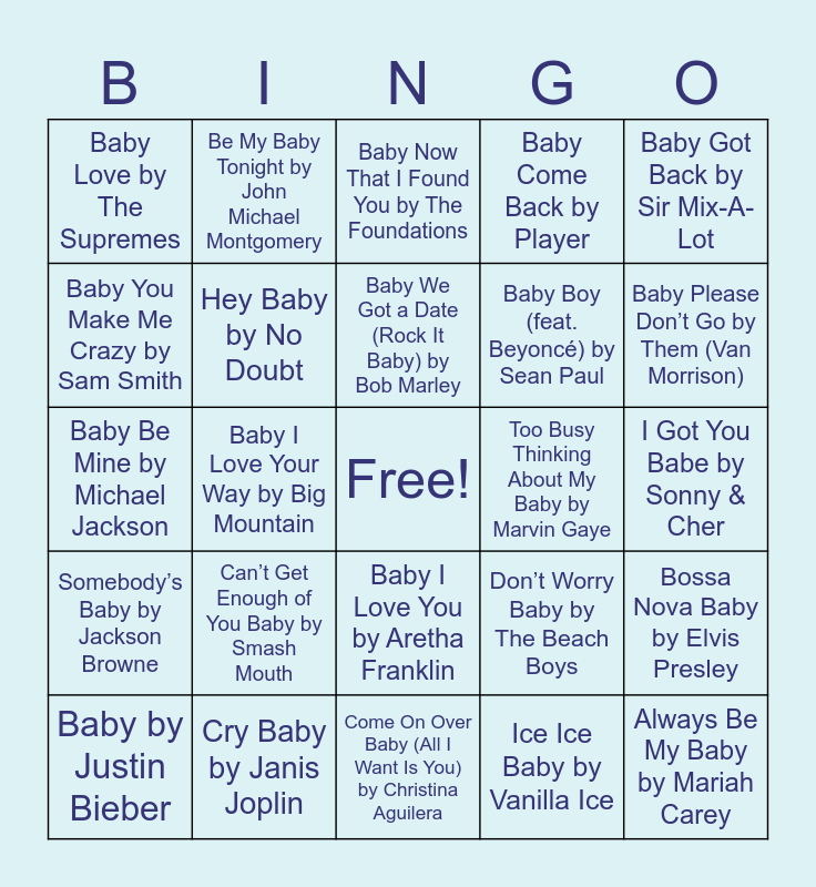 This bingo card has a free space and 29 words: Baby by Justin Bieber, Be My Baby by The Ronettes, Baby I Love Your Way by Big Mountain, …Baby One More Time by Britney Spears, Baby Love by The Supremes, Baby Now That I Found You by The Foundations, Hey Baby by No Doubt, Can’t Get Enough of You Baby by Smash Mouth, Too Busy Thinking About My Baby by Marvin Gaye, Cry Baby by Janis Joplin, I Got You Babe by Sonny & Cher, Always Be My Baby by Mariah Carey, Come On Over Baby (All I Want Is You) by Christina Aguilera, Ice Ice Baby by Vanilla Ice, Baby Please Don’t Go by Them (Van Morrison), Baby Baby by Amy Grant, Baby I Love You by Aretha Franklin, Somebody’s Baby by Jackson Browne, Baby Got Back by Sir Mix-A-Lot, Baby Be Mine by Michael Jackson, Don’t Worry Baby by The Beach Boys, Rock wit U (Awww Baby) by Ashanti, Baby Boy (feat. Beyoncé) by Sean Paul, Baby You Make Me Crazy by Sam Smith, Baby Come Back by Player, Be My Baby Tonight by John Michael Montgomery, Bossa Nova Baby by Elvis Presley, Baby We Got a Date (Rock It Baby) by Bob Marley and Tell Me Baby by Red Hot Chili Peppers.