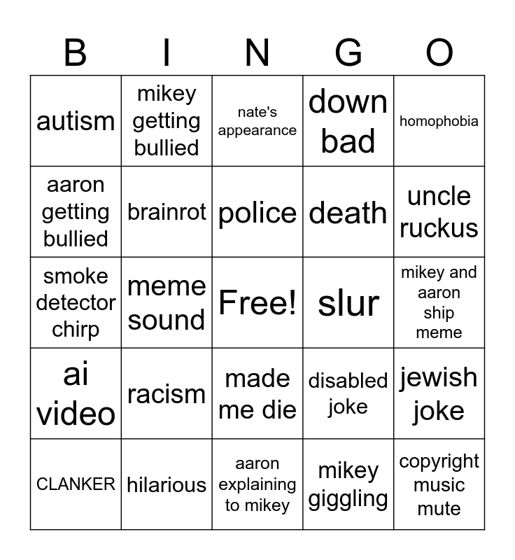 This bingo card has a free space and 24 words: racism, hilarious, police, CLANKER, homophobia, autism, aaron getting bullied, mikey getting bullied, slur, made me die, death, smoke detector chirp, disabled joke, jewish joke, brainrot, mikey giggling, mikey and aaron ship meme, nate's appearance, uncle ruckus, meme sound, copyright music mute, ai video, down bad and aaron explaining to mikey.