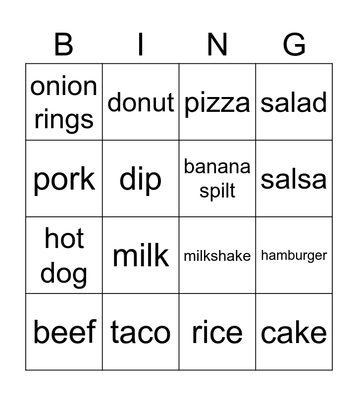 This bingo card has 20 words: hamburger, fish, pizza, French fries, beef, pork, taco, onion rings, hot dog, donut, milk, milkshake, dip, cake, banana spilt, sundae, salsa, salad, rice and fruit bowl.