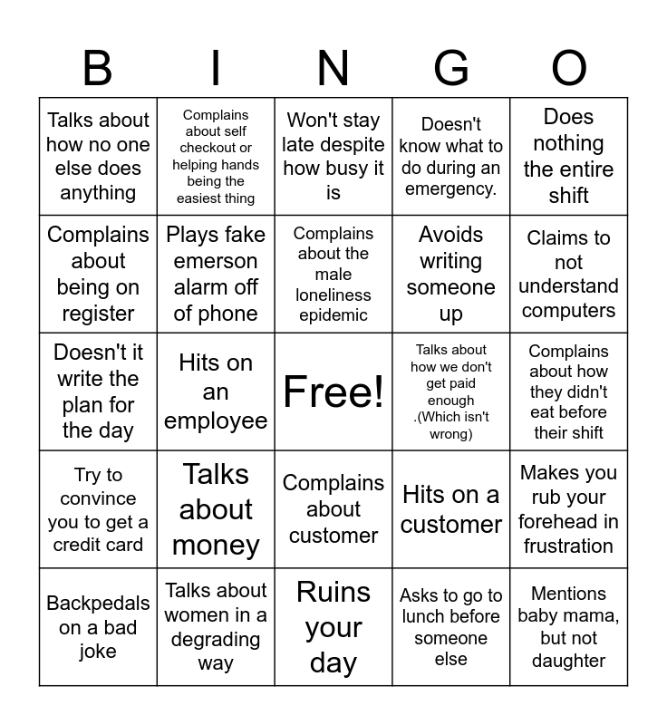 This bingo card has a free space and 24 words: Talks about money, Talks about women in a degrading way, Complains about the male loneliness epidemic, Backpedals on a bad joke, Does nothing the entire shift, Talks about how no one else does anything, Complains about being on register, Complains about self checkout or helping hands being the easiest thing, Talks about how we don't get paid enough .(Which isn't wrong), Complains about customer, Avoids writing someone up, Doesn't it write the plan for the day, Hits on a customer, Makes you rub your forehead in frustration, Plays fake emerson alarm off of phone, Asks to go to lunch before someone else, Complains about how they didn't eat before their shift, Won't stay late despite how busy it is, Claims to not understand computers, Hits on an employee, Mentions baby mama, but not daughter, Try to convince you to get a credit card, Doesn't know what to do during an emergency. and Ruins your day.