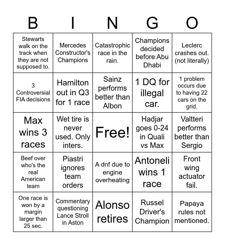 This bingo card has a free space and 24 words: Piastri ignores team orders, Commentary questioning Lance Stroll in Aston, Sainz performs better than Albon, One race is won by a margin larger than 25 sec., Leclerc crashes out. (not literally), Stewarts walk on the track when they are not supposed to., 3 Controversial FIA decisions, Mercedes Constructor's Champions, Hadjar goes 0-24 in Quali vs Max, A dnf due to engine overheating, 1 DQ for illegal car., Max wins 3 races, Antoneli wins 1 race, Front wing actuator fail., Hamilton out in Q3 for 1 race, Russel Driver's Champion, Valtteri performs better than Sergio, Catastrophic race in the rain., 1 problem occurs due to having 22 cars on the grid., Wet tire is never used. Only inters., Papaya rules not mentioned., Beef over who's the real American team, Champions decided before Abu Dhabi and Alonso retires.