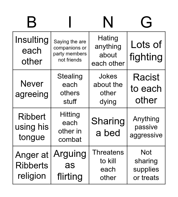 This bingo card has 16 words: Arguing as flirting, Anything passive aggressive, Hating anything about each other, Insulting each other, Ribbert using his tongue, Saying the are companions or party members not friends, Sharing a bed, Threatens to kill each other, Never agreeing, Stealing each others stuff, Anger at Ribberts religion, Lots of fighting, Hitting each other in combat, Racist to each other, Jokes about the other dying and Not sharing supplies or treats.