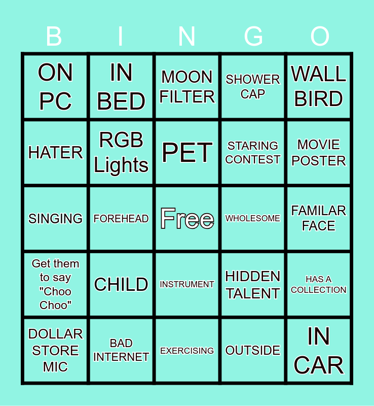 This bingo card has a free space and 24 words: CHILD, BAD INTERNET, PET, DOLLAR STORE MIC, WALL BIRD, ON PC, HATER, IN BED, WHOLESOME, INSTRUMENT, STARING CONTEST, SINGING, HIDDEN TALENT, HAS A COLLECTION, RGB Lights, OUTSIDE, FAMILAR FACE, MOON FILTER, MOVIE POSTER, FOREHEAD, IN CAR, Get them to say "Choo Choo", SHOWER CAP and EXERCISING.