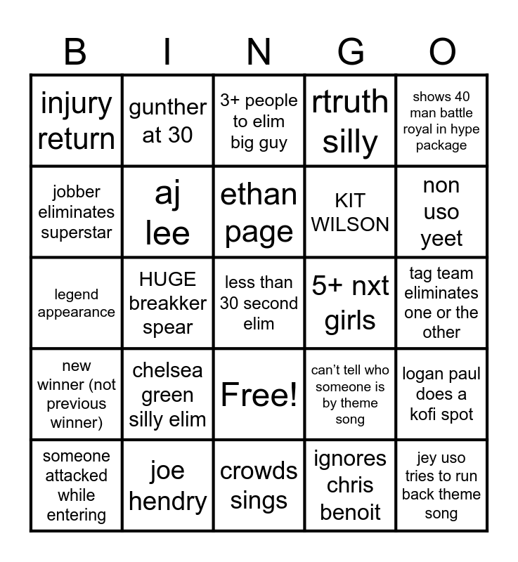 This bingo card has 26 words: Free!, ignores chris benoit, ethan page, joe hendry, shows 40 man battle royal in hype package, injury return, jobber eliminates superstar, gunther at 30, tag team eliminates one or the other, can’t tell who someone is by theme song, KIT WILSON, legend appearance, logan paul does a kofi spot, someone attacked while entering, HUGE breakker spear, tna person, rtruth silly, new winner (not previous winner), 3+ people to elim big guy, less than 30 second elim, non uso yeet, crowds sings, 5+ nxt girls, chelsea green silly elim, aj lee and jey uso tries to run back theme song.