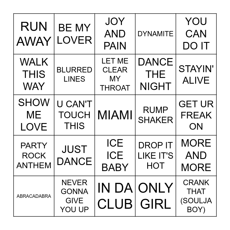 This bingo card has 55 words: ...BABY ONE MORE TIME, ABRACADABRA, WHAT IS LOVE, RUN AWAY, IN DA CLUB, BETTER OFF ALONE, BLURRED LINES, DA' DIP, DANCE THE NIGHT, GET BUSY, DYNAMITE, DON'T STOP THE ROCK, LEVITATING, GIVE IT UP, TIME OF OUR LIVES, THE REFLEX, YOU CAN DO IT, U CAN'T TOUCH THIS, GETTIN' JIGGY WIT IT, MIAMI, RUMP SHAKER, HERE COMES THE HOT STEPPER, DROP IT LIKE IT'S HOT, JOY AND PAIN, GET LOW, LET ME CLEAR MY THROAT, ONLY GIRL, ON THE FLOOR, GET UR FREAK ON, MORE AND MORE, I LIKE TO MOVE IT, TITANIUM, DON'T CHA, NOW THAT WE FOUND LOVE, WALK THIS WAY, SHOW ME LOVE, AIN'T MY FAULT, PARTY ROCK ANTHEM, CRANK THAT (SOULJA BOY), CAN YOU FEEL THE BEAT, BE MY LOVER, SHUT UP AND DANCE, LONDON BRIDGE, CONGA!, JUST DANCE, NEVER GONNA GIVE YOU UP, MILKSHAKE, RHYTHM IS A DANCER, THE RHYTHM OF THE NIGHT, STAYIN' ALIVE, TURN DOWN FOR WHAT, TURN ME ON, THONG SONG, ICE ICE BABY and I WANNA DANCE WITH SOMEBODY (WHO LOVES ME).