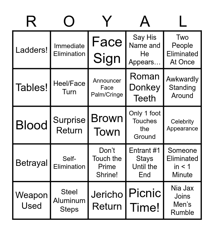 This bingo card has a free space and 32 words: Picnic Time!, Surprise Entrance, Surprise Return, Green Shirt Guy, Betrayal, Heel/Face Turn, Two People Eliminated At Once, Someone Eliminated in < 1 Minute, Immediate Elimination, Botchamania!, Announcer Face Palm/Cringe, Face Sign, Funny Sign, Wardrobe Malfunction, Only 1 foot Touches the Ground, Foreign Object Used, Weapon Used, Blood, Don’t Touch the Prime Shrine!, Self-Elimination, Entrant #1 Stays Until the End, Wrestler From Another Promotion, Celebrity Appearance, Steel Aluminum Steps, Nia Jax Joins Men’s Rumble, Say His Name and He Appears…, Roman Donkey Teeth, Tables!, Ladders!, Jericho Return, 1 Person Eliminates 5 During Match and Awkwardly Standing Around.