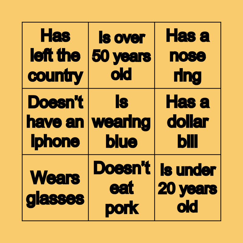This bingo card has 9 words: Wears glasses, Has a nose ring, Is over 50 years old, Doesn’t have an iphone, Has left the country, Has a dollar bill, Is wearing blue, Is under 20 years old and Doesn’t eat pork.