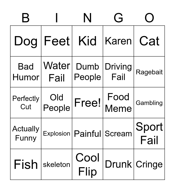 This bingo card has a free space and 24 words: Explosion, skeleton, Dumb People, Fish, Cat, Dog, Bad Humor, Feet, Food Meme, Painful, Driving Fail, Perfectly Cut, Scream, Sport Fail, Water Fail, Drunk, Gambling, Kid, Ragebait, Old People, Cringe, Actually Funny, Karen and Cool Flip.