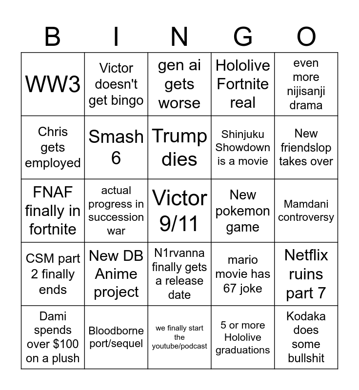 This bingo card has a free space and 24 words: New DB Anime project, Bloodborne port/sequel, Trump dies, Dami spends over $100 on a plush, even more nijisanji drama, WW3, Chris gets employed, Victor doesn't get bingo, New pokemon game, N1rvanna finally gets a release date, Shinjuku Showdown is a movie, FNAF finally in fortnite, mario movie has 67 joke, Netflix ruins part 7, Smash 6, 5 or more Hololive graduations, Mamdani controversy, gen ai gets worse, New friendslop takes over, actual progress in succession war, Kodaka does some bullshit, CSM part 2 finally ends, Hololive Fortnite real and we finally start the youtube/podcast.