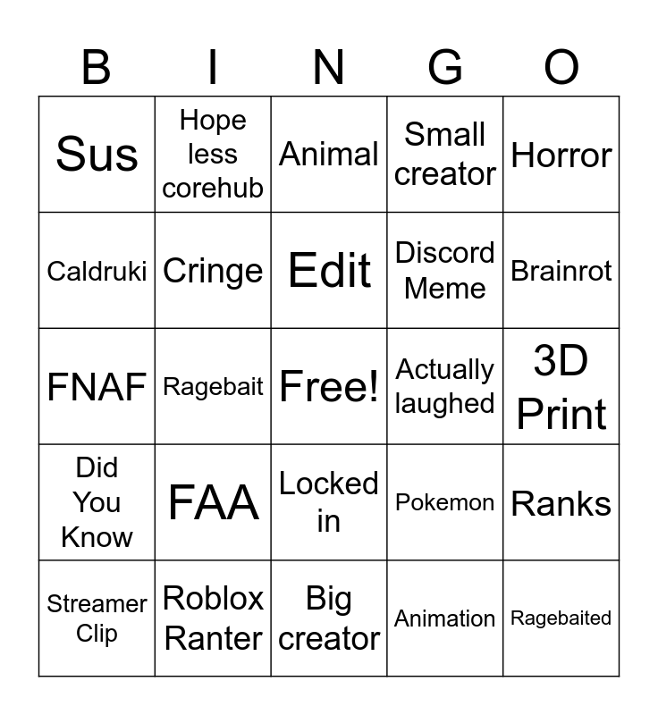 This bingo card has a free space and 24 words: FAA, Roblox Ranter, Edit, Streamer Clip, Horror, Sus, Caldruki, Hope less corehub, Actually laughed, Locked in, Discord Meme, FNAF, Pokemon, Ranks, Cringe, Animation, 3D Print, Animal, Brainrot, Ragebait, Ragebaited, Did You Know, Small creator and Big creator.