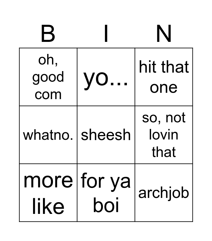 This bingo card has a free space and 8 words: whatno., yo..., so, not lovin that, more like, hit that one, oh, good com, for ya boi and archjob.