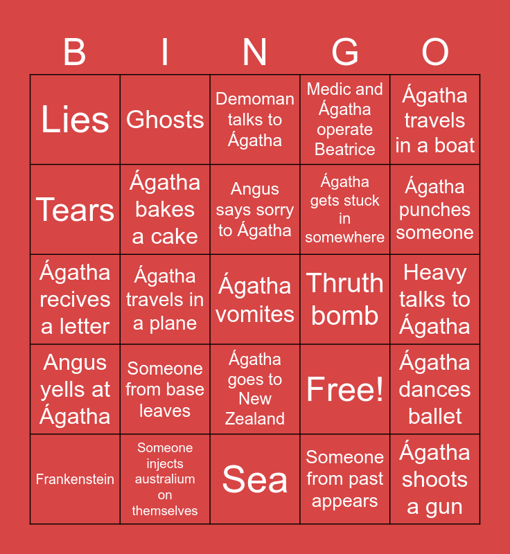 This bingo card has 25 words: Someone from base leaves, Sea, Angus says sorry to Ágatha, Frankenstein, Ágatha travels in a boat, Lies, Tears, Ghosts, Thruth bomb, Ágatha goes to New Zealand, Ágatha gets stuck in somewhere, Ágatha recives a letter, Free!, Ágatha dances ballet, Ágatha bakes a cake, Ágatha shoots a gun, Heavy talks to Ágatha, Demoman talks to Ágatha, Ágatha punches someone, Ágatha travels in a plane, Ágatha vomites, Someone injects australium on themselves, Angus yells at Ágatha, Medic and Ágatha operate Beatrice and Someone from past appears.