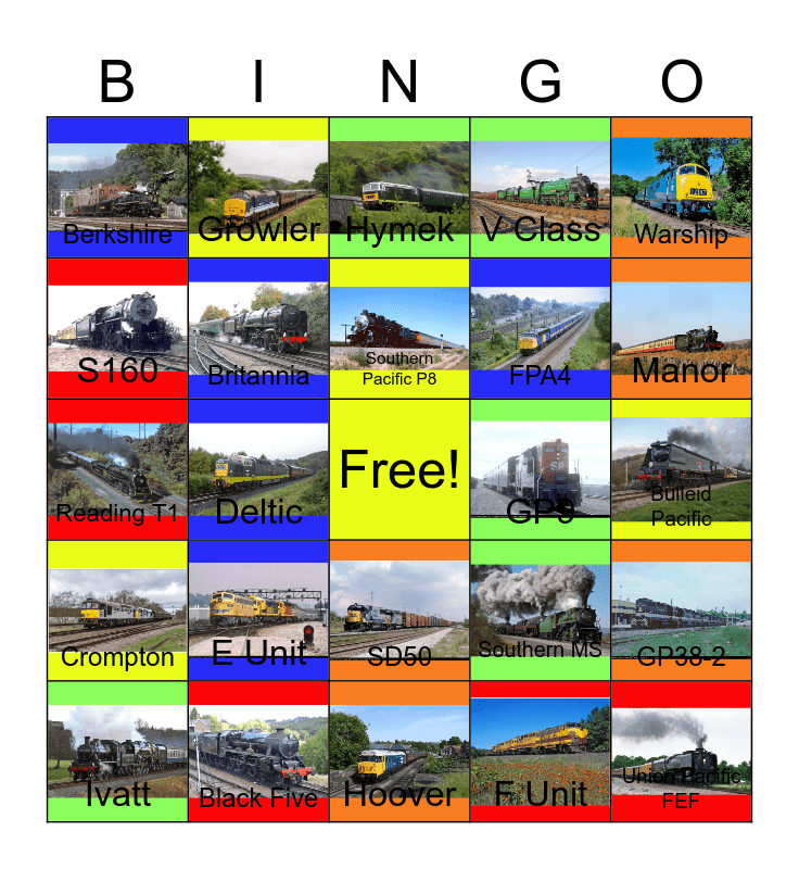 This bingo card has 24 images, a free space and 24 words: E Unit, Black Five, Southern Pacific P8, Ivatt, Warship, Berkshire, S160, Growler, GP9, SD50, FPA4, Reading T1, Southern MS, GP38-2, Britannia, F Unit, Bulleid Pacific, Hymek, Manor, Deltic, Union Pacific FEF, Crompton, V Class and Hoover.