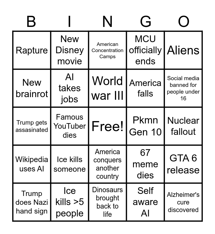 This bingo card has a free space and 24 words: Ice kills someone, Ice kills >5 people, World war III, Trump does Nazi hand sign, Aliens, Rapture, New brainrot, New Disney movie, Pkmn Gen 10, America conquers another country, America falls, Trump gets assasinated, 67 meme dies, GTA 6 release, AI takes jobs, Self aware AI, Nuclear fallout, American Concentration Camps, Social media banned for people under 16, Famous YouTuber dies, Alzheimer's cure discovered, Wikipedia uses AI, MCU officially ends and Dinosaurs brought back to life.