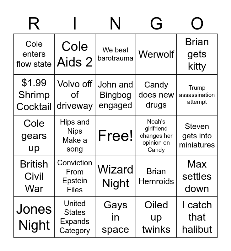 This bingo card has a free space and 24 words: Conviction From Epstein Files, United States Expands Category, John and Bingbog engaged, Jones Night, Brian gets kitty, Cole enters flow state, $1.99 Shrimp Cocktail, Cole Aids 2, Noah's girlfriend changes her opinion on Candy, Wizard Night, Candy does new drugs, Cole gears up, Brian Hemroids, Max settles down, Volvo off of driveway, Oiled up twinks, Steven gets into miniatures, We beat barotrauma, Trump assassination attempt, Hips and Nips Make a song, I catch that halibut, British Civil War, Werwolf and Gays in space.