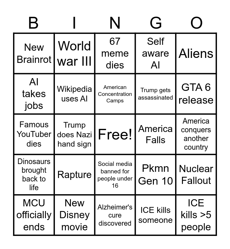 This bingo card has a free space and 24 words: Rapture, New Disney movie, American Concentration Camps, MCU officially ends, Aliens, New Brainrot, AI takes jobs, World war III, America Falls, Social media banned for people under 16, Trump gets assassinated, Famous YouTuber dies, Pkmn Gen 10, Nuclear Fallout, Wikipedia uses AI, ICE kills someone, America conquers another country, 67 meme dies, GTA 6 release, Trump does Nazi hand sign, ICE kills >5 people, Dinosaurs brought back to life, Self aware AI and Alzheimer's cure discovered.