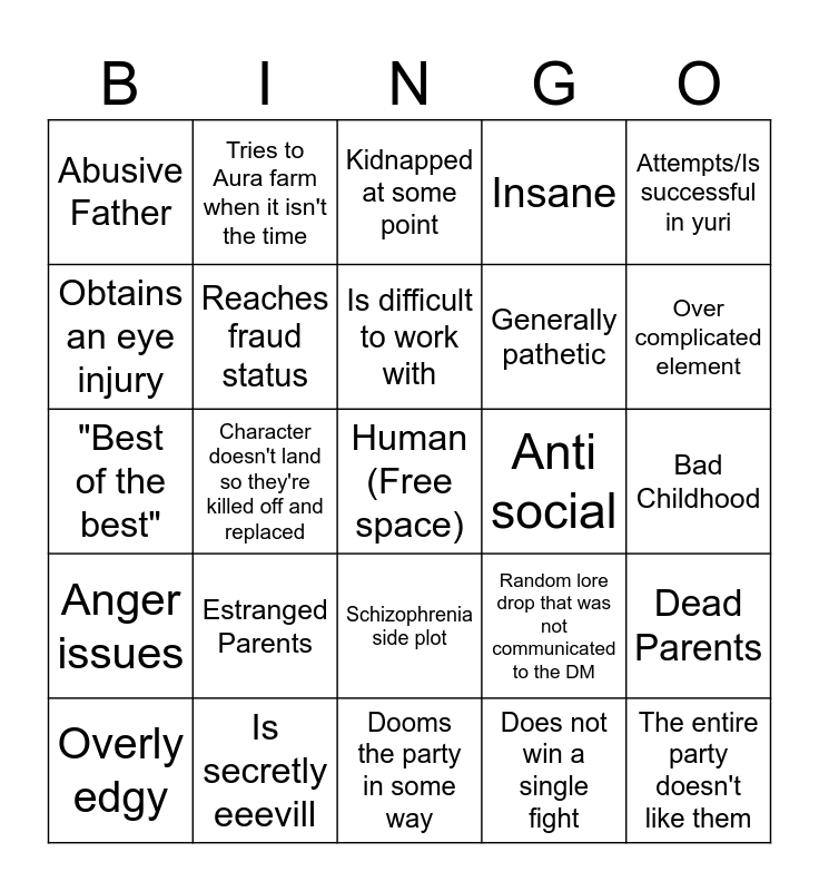 This bingo card has a free space and 24 words: Estranged Parents, Is secretly eeevill, Is difficult to work with, Overly edgy, Attempts/Is successful in yuri, Abusive Father, Obtains an eye injury, Tries to Aura farm when it isn't the time, Anti social, Schizophrenia side plot, Generally pathetic, "Best of the best", Random lore drop that was not communicated to the DM, Dead Parents, Reaches fraud status, Does not win a single fight, Bad Childhood, Kidnapped at some point, Over complicated element, Character doesn't land so they're killed off and replaced, The entire party doesn't like them, Anger issues, Insane and Dooms the party in some way.