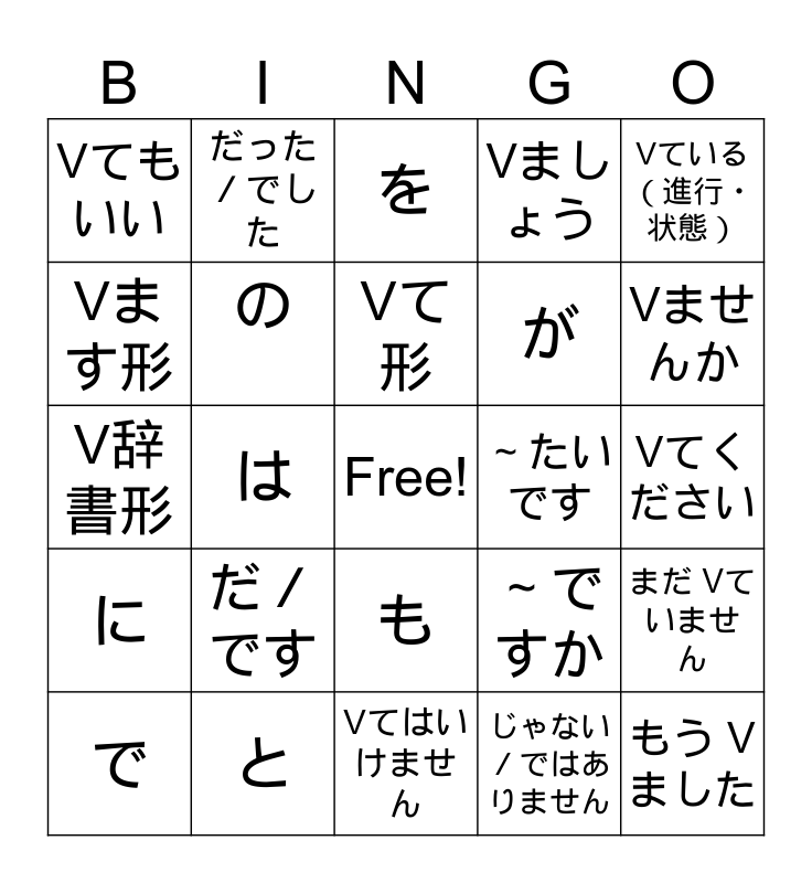 This bingo card has a free space and 24 words: だ/です, と, Vて形, で, Vている(進行・状態), Vてもいい, Vます形, だった/でした, ~たいです, も, が, V辞書形, ~ですか, まだ Vていません, の, じゃない/ではありません, Vてください, を, Vませんか, は, もう Vました, に, Vましょう and Vてはいけません.