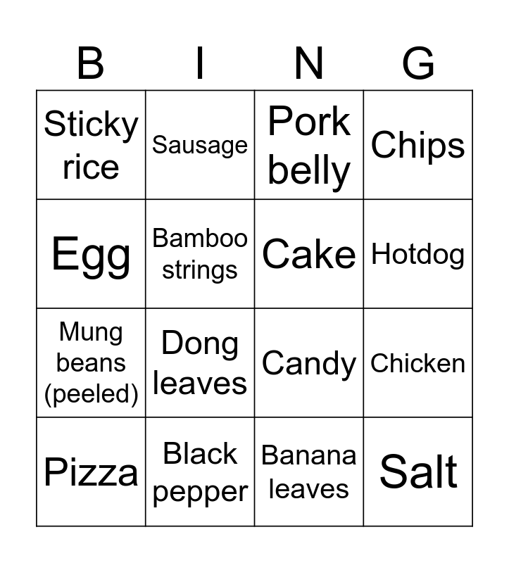 This bingo card has 16 words: Black pepper, Chicken, Pork belly, Sticky rice, Mung beans (peeled), Sausage, Candy, Banana leaves, Egg, Bamboo strings, Pizza, Chips, Dong leaves, Hotdog, Cake and Salt.