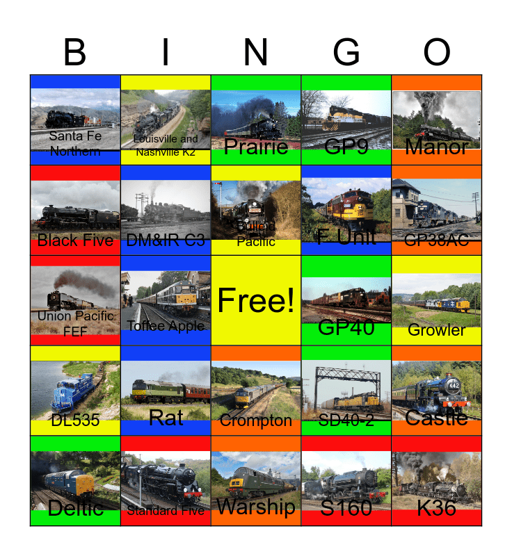 This bingo card has 24 images, a free space and 24 words: Rat, Standard Five, Bulleid Pacific, Deltic, Manor, Santa Fe Northern, Black Five, Louisville and Nashville K2, GP40, Crompton, F Unit, Union Pacific FEF, SD40-2, Castle, DM&IR C3, S160, Growler, Prairie, GP38AC, Toffee Apple, K36, DL535, GP9 and Warship.